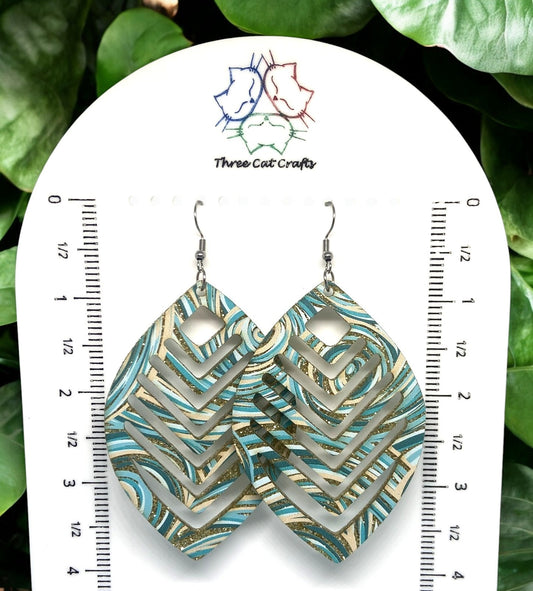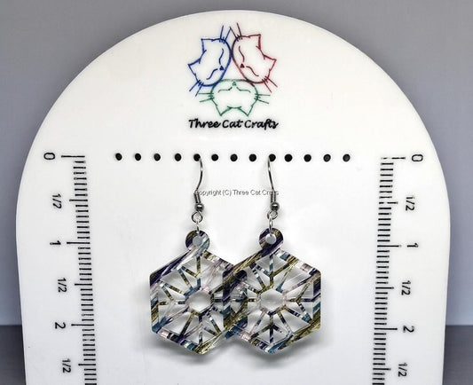 Hexagon Acrylic Earrings with lines of Brown, Blue, Gold, White & Black