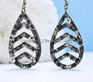 Grey, Black and White Floral Patterned Teardrop Earrings