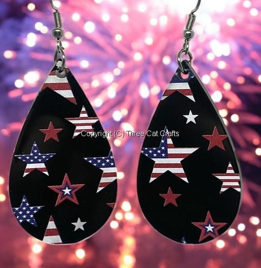 Patriotic Teardrop Earrings – Black Acrylic with Red, White & Blue Stars