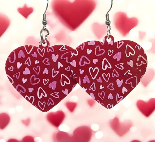 Red Acrylic Heart Earrings with White and Pink Printed Hearts